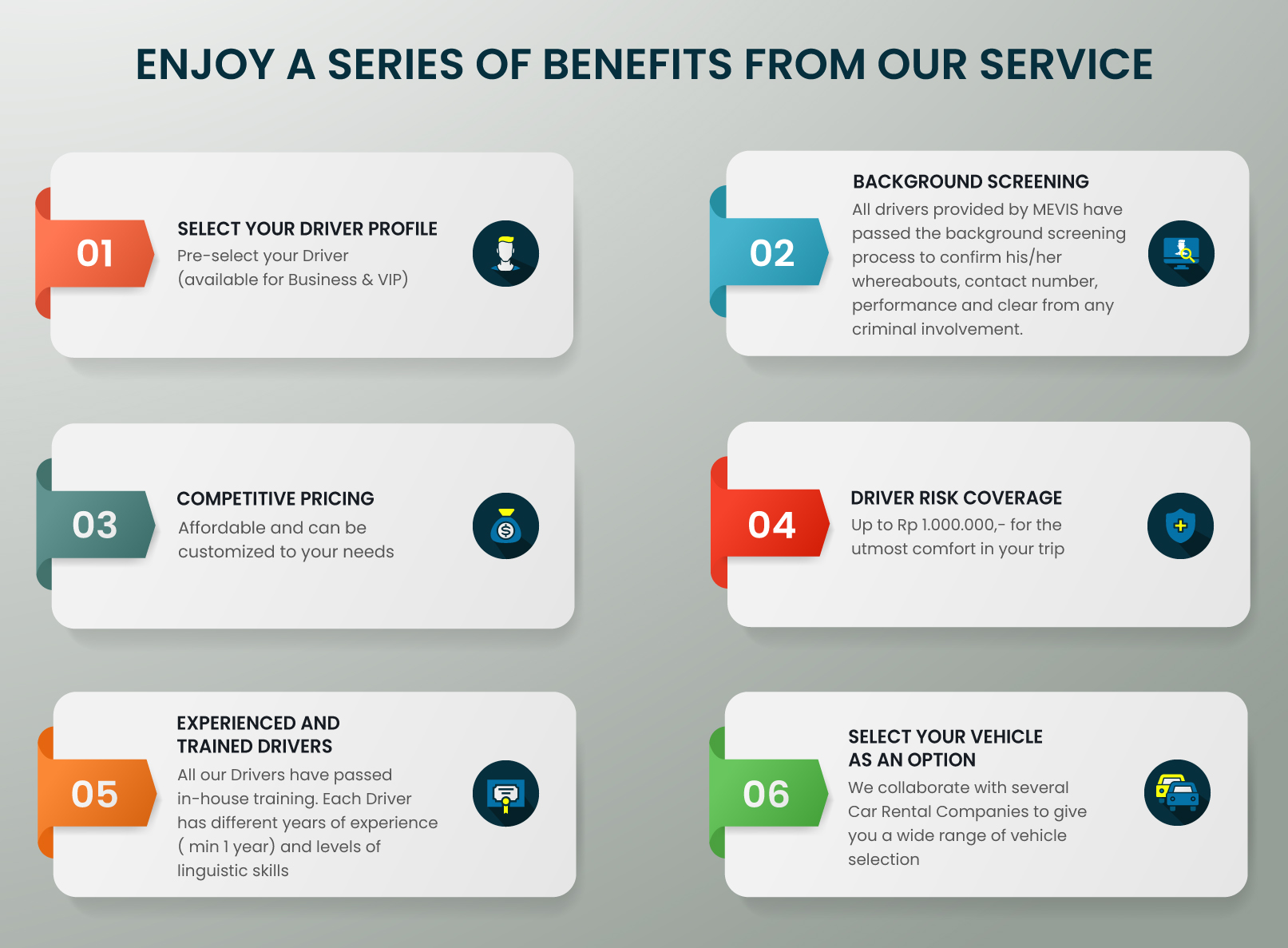 As your appointed Driver service, we assure consistent driver availability. Clients do not need to deal with Driver’s absence, permission, or resignation. MEVIS system covers recruitment, interview & screening, and placement to assure that you are 100% FREE from the hassle.